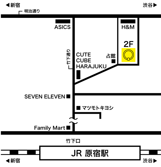 - 左手のセブンイレブンを通り過ぎ、次の右角にCUTE CUBE HARAJUKUがあります